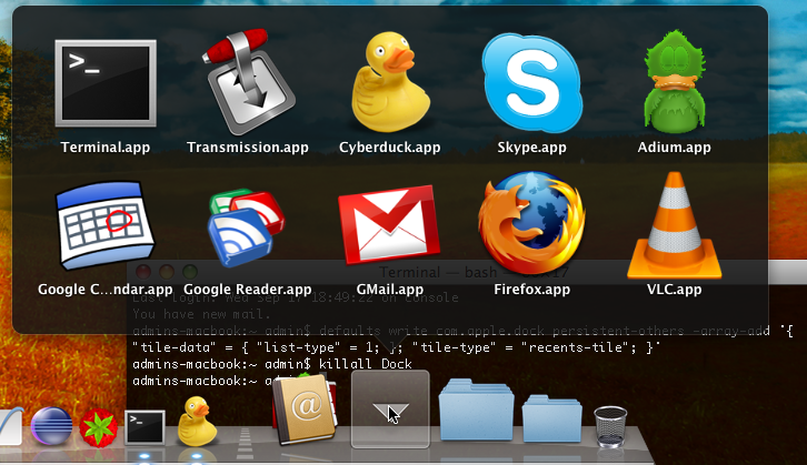 Για να προσθέσουμε τις πρόσφατες εφαρμογές σαν stack στο dock ανοίγουμε ένα Terminal και δίνουμε την ακόλουθη εντολή